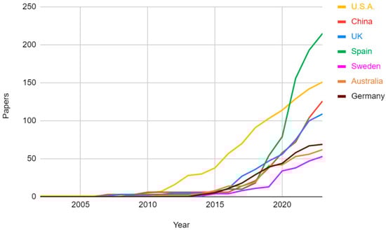 The second set of results we analyzed were the most productive countries and their associated collaboration networks, i.e., the links between authors and co-authorships were calculated using papers where at least one co-author is from a different country []. In addition, we analyzed the countries’ scientific production over time by evaluating the relative proportionality of the number of publications of the first seven countries with the highest current productivity.