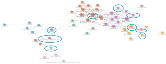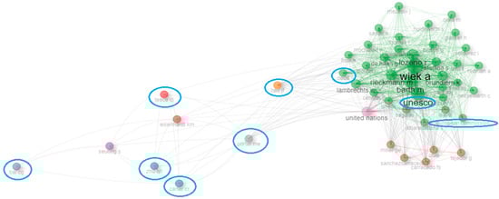 An author and related co-citation networks analysis can be useful to compare different intellectual topic structures. We have primarily focused on co-citation networks, which are calculated when two articles are cited in a third article []. The network consists of nodes, the size of which is proportional to the occurrence and links which, in turn, are proportional to the co-occurrences, highlighting the strength of the links. In addition, different colors indicate an author’s affiliation to a particular scientific community (see Table A1 and Table A2 in the Appendix A for the details). Figure 7 and Figure 8 show the co-citation networks for green skills and sustainability competences, where we have drawn a blue circle for authors or sources that are also represented in the other topic (see Table A1 and Table A2 in the Appendix A for the complete list of authors). However, there are other authors who appear in both topics, even if they are not represented in both co-citation networks. For instance, Presha Ramsarup, Eureta Rosenberg, Khan Syed, and Heila Lotz-Sisitika are prolific authors on the topic of green skills, but only have one publication on the other topic, and the number of publications is not relevant. In addition, we found that the top ten authors in these topics with a higher relevance index (between 10 and 3 h- and g-indexes and between 2 and 0.6 m-indexes) do not have a single publication in the other topic.