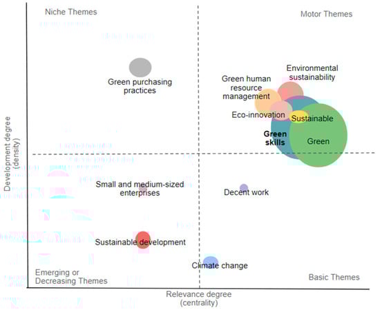 Thematic map on green skills. Each keyword is assigned to only one topic, which is represented in a cluster with different colors.