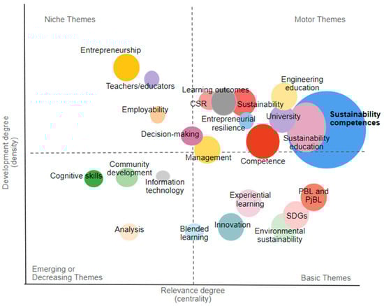 Finally, we conducted a thematic analysis combining the performance analysis and science mapping to show the main theme of the topics in a special diagram delineating the fundamental and driving topics on the right and the niche and emerging or declining themes on the left, based on the authors’ keywords due to the better quality of these data in the WoS database []. Each keyword is assigned to only one topic, which is represented in a cluster with different colors (Figure 9 and Figure 10). For the green skills topic, the driving themes are mainly “green” and “green skills”, followed by “green human resource management” and “environmental sustainability”, and then by “eco-innovation” and “sustainable”. The basic issues that have proven to be fundamental to this topic are decent work and, more recently, climate change. Only one niche theme emerges in the diagrams, namely green procurement practices, while the emerging themes associated with the green skills topic are small and medium enterprises and sustainable development. On the topic of sustainability competences, the driving themes are mainly sustainability competences and sustainability education, followed by university, engineering education, sustainability, learning outcomes, entrepreneurial resilience, and, more specifically, corporate social responsibility (CSR), decision making, and, more recently, management. The fundamental themes in the sustainability competences topic are problem- and project-based learning (PBL and PjBL), sustainable development goals, environmental sustainability, experiential learning, innovation, and, more recently, blended learning. The more specific themes are entrepreneurship, teachers, and employability. Finally, the new themes are cognitive skills, community development, information technology, and analysis.