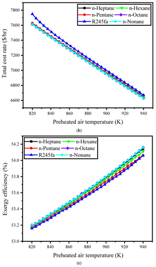 Among various systems, the gas turbine (GT) system is potentially suitable as a topping cycle due to being cost-effective, efficient, and being able to use a wide range of hydrocarbon fuels [9,10]. However, without WHR, about 60% of the energy in a typical GT is rejected into the atmosphere at high temperature [11,12]. Using the advanced gas turbine in the hybrid system results in an enhanced energy efficiency of 50–58% [13]. As a result, the efficiency of the entire plant can be improved by integrating the bottoming cycle with the GT system. Much effort has been committed to boost the efficiencies of the conventional GT cycles. Among these is CGAM cogeneration system, which integrates a gas turbine with a heat recovery steam generator (HRSG) and an air preheater [14,15,16]. The utilization of air preheater boosts the efficiencies based on exergy and energy of the system, as the air passing into the combustion chamber absorbs heat from the hot gases leaving the turbine, which lowers fuel consumption. It is potentially advantageous to use this type of heat exchanger when the temperature of the air entering the combustion chamber is less than the temperature of the gases exiting the turbine; otherwise, the efficiency of the system can drop. The GT cycle is most extensively employed in the aviation [17,18,19] and maritime industries [20].