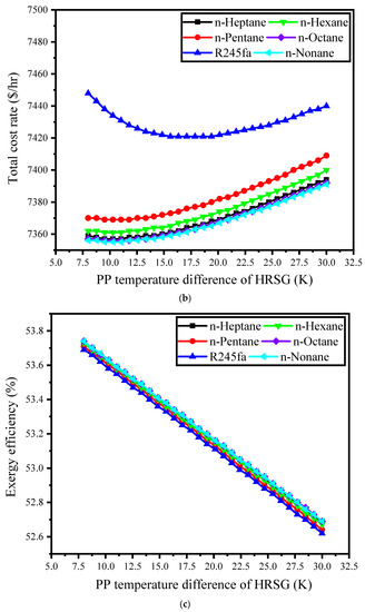 Several systems have been suggested for their use as a low-temperature cycle in hybrid gas turbine-based plants. A steam Rankine cycle has been often used as the low-temperature cycle for a GT system. However, steam Rankine cycle has some significant disadvantages. This cycle utilizes water as the working fluid, and it is necessary to superheat water before inputting it to the turbine. Otherwise, there is the potential for erosion of turbine blades, and utilization of expensive and complex turbines [28]. To overcome these challenges, organic working fluids are proposed as alternatives. An organic fluid typically has a critical pressure and temperature and molecular mass higher than water [1,28]. One of the main cycles in the WHR field is the ORC. This system utilizes an organic working fluid and avoids many of the issues of the steam Rankine cycle. Due to the simplicity, reliability, and adaptability of the ORC, it has recently attracted a great deal of research interest [29,30]. The major drawback with this cycle is that the evaporation process occurs at an unchanged temperature, which leads to a pinch point problem. This difficulty is caused by the lack of sufficient temperature compatibility between the two fluid flows during heat transfer, which lowers the exergy efficiency and causes notable exergy destruction in heat exchangers.