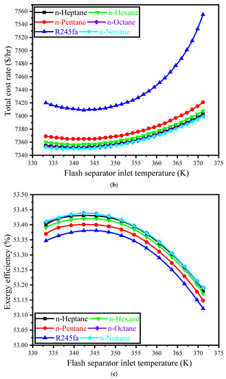 Ho et al. [49] demonstrated that the energy efficiencies of the OFC and the optimized ORC for low-grade heat sources are the same. Moreover, aromatic hydrocarbons were reported as the most suitable working fluids to be utilized in OFCs and ORCs. Mondal and De [50] utilized R600-R245fa mixture as the OFC working fluid to reuse the waste heat of the flue gas devoid of SO2. The GWP of this mixture is less than 800 kg of CO2 per kg of fluid. This mixture can provide a higher output power for the OFC than that of the OFC utilizing pure working fluids. The thermodynamic and thermo-economic characteristics of four OFC systems using five distinct working fluids were compared by Nemati et al. [51]. A simple OFC was seen to have the highest and the lowest cost per unit of produced electricity and exergy efficiency, respectively. The exergy investigation demonstrated that the enhanced expander-OFC has the greatest performance. However, the dual flash OFC attained the greatest economic performance out of the three proposed configurations. The best exergo-economic and exergy performances of systems were obtained when toluene was utilized as the working fluid. An organic Rankine flash cycle (ORFC) integrates the trilateral cycle with the ORC. De Campos et al. [52] compared the ORFC with the OFC, demonstrating that the greatest exergy efficiency is attained for the ORFC at lower volume flow ratio of the two-phase expansion than the OFC. Moreover, the exergy and energy efficiencies of the ORFC were higher than those of the OFC when utilizing pentane as the working fluid. Economic, exergy, and energy assessments of an ORFC were evaluated by Wang et al. [53]. They determined that utilizing working fluids with higher critical temperatures offer improved energy efficiencies and lower power costs. Based on the optimization findings, the ORFC was able to perform thermodynamically better than the ORC and the OFC. Wu et al. [54] evaluated an OFC integrated with a S-CO2 recompression Brayton cycle (SCRBC) thermodynamically and thermo-economically. In this system, the OFC was utilized as the bottoming cycle to reuse the SCRBC waste heat. The findings revealed that the product overall unit cost and the exergy efficiency of the SCRBC integrated with the OFC were, respectively, 3.75% lower than and 6.57% higher than those of the standalone SCRBC. Moreover, the SCRBC combined with the OFC exhibited better thermo-economic and thermodynamic performances compared to the SCRBC integrated with the ORC. The authors considered seven different OFC working fluids, and the findings illustrated that the best thermo-economic and thermodynamic performances were obtained with n-nonane. For enhancing the performance of the SCRBC, three distinct bottoming systems, including Kalina cycle, OFC, and ORC, were considered to reuse the SCRBC waste heat and evaluated from the viewpoints of thermo-economics and thermodynamics by Mahmoudi et al. [55]. The SCRBC/ORC and SCRB/Kalina cycles showed the greatest and the lowest exergy efficiencies, respectively, while the SCRBC/ORC exhibited the best thermo-economic performance. Ten distinct working fluids were employed for the OFC and the ORC. The best thermodynamic and economic performances were achieved with n-nonane and R134a for the OFC and ORC, respectively.