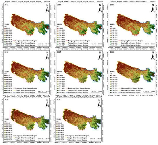 The SIF data within one year is averaged to obtain the SIF value year by year. The annual mean SIF values were processed to obtain an average annual SIF distribution map of the TRHR. The results are shown in Figure 2 and Figure 3. From 2001 to 2020, the overall SIF value of the TRHR ranged from 0.05 to 0.073, with a maximum value of 0.073 in 2005 and 2009, and a minimum value of 0.05 in 2002. The overall SIF value showed a gradual upward trend. The SIF value in TRHR shows spatial characteristics of high in the east and low in the west.