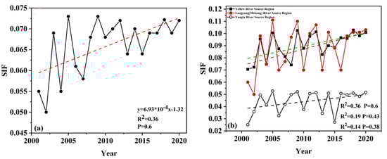 (a) Inter-annual variations in SIF in the TRHR; (b) inter-annual variations in SIF in YZR, LCR and YR.