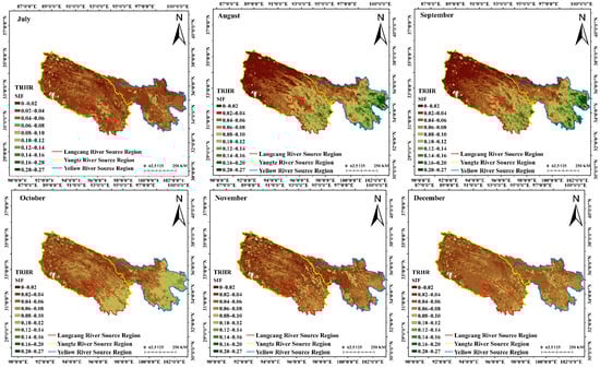 The monthly average SIF value was obtained by averaging the SIF data of each month, and the results are shown in Figure 4 and Figure 5. From January to May, the SIF value showed an upwards trend overall, reaching 0.055. It rose sharply from June, reached the maximum value of 0.107 in August, and then started to decrease and continued to decrease until December. The lowest SIF value occurred in December, at 0.008. Previous studies have shown that the beginning period for vegetation growth in the TRHR spans from days of the year 125–155, the end period of growth spans from days 280–290, and the length of the growing season lasts between 130 and 160 days. Thus, the SIF changes identified herein were consistent with the phenological periods in the TRHR [25]. From January to May and November to December, there was little difference in SIF values between the east and west of TRHR. From June to October, the SIF values showed a trend of high in the east and low in the west.