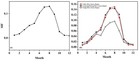 (a) Monthly variations in SIF in the TRHR; (b) monthly variations in SIF in YZR, LCR and YR.