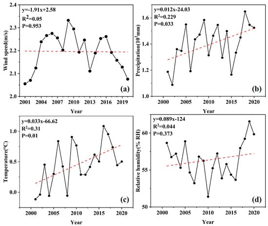 Changes in meteorological factors in the TRHR from 2001 to 2022. (a) denotes the interannual variation of wind speed; (b) denotes the interannual variation of precipitation; (c) denotes the interannual variation of temperature; and (d) denotes the interannual variation of relative humidity.