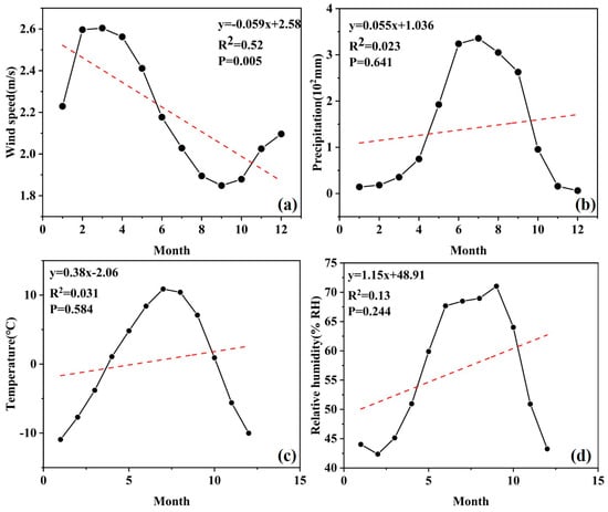 Changes in meteorological factors in the TRHR from January to December. (a) denotes the monthly variation of wind speed; (b) denotes the monthly variation of precipitation; (c) denotes the monthly variation of temperature; and (d) denotes the monthly variation of relative humidity.