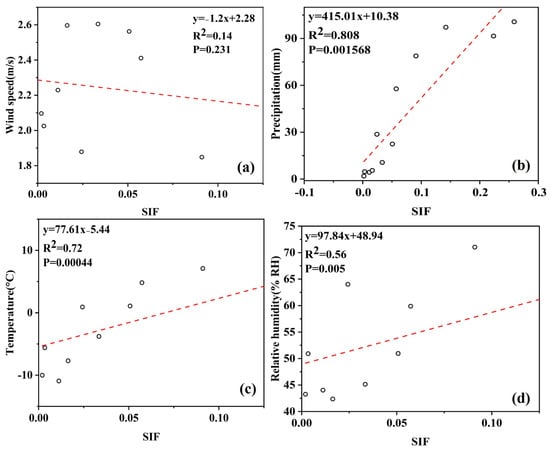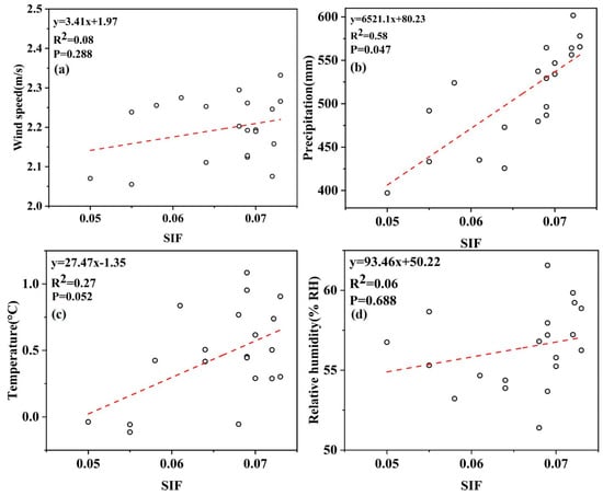 Relationships between annual average SIF and climate conditions from 2001 to 2020. (a) denotes the correlation between the annual average SIF and wind; (b) denotes the correlation between the annual average SIF and precipitation; (c) denotes the correlation between the annual average SIF and temperature; and (d) denotes the correlation between the annual average SIF and relative humidity.