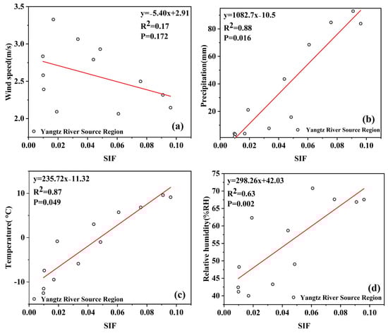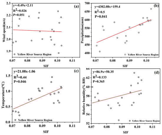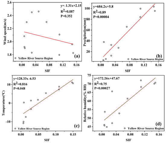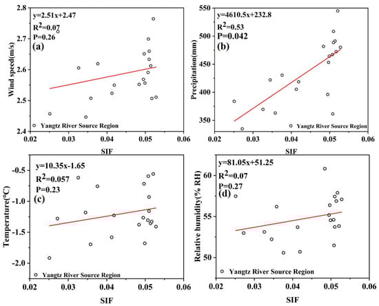 Relationships between SIF and climate conditions from 2001 to 2020 in YR. (a) denotes the correlation between SIF and the mean annual wind; (b) denotes the correlation between SIF and the mean annual precipitation; (c) denotes the correlation between SIF and the mean annual temperature; and (d) denotes the correlation between SIF and the mean annual relative humidity.