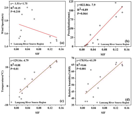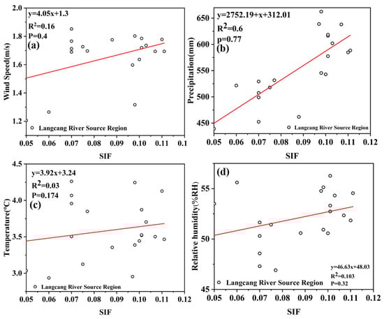 Relationships between SIF and climate conditions from 2001 to 2020 in LCR. (a) denotes the correlation between SIF and the mean annual wind; (b) denotes the correlation between SIF and the mean annual precipitation; (c) denotes the correlation between SIF and the mean annual temperature; and (d) denotes the correlation between SIF and the mean annual relative humidity.
