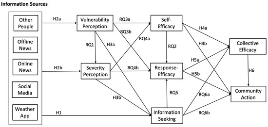 To illustrate the interrelationships between all theoretical constructs tested in the proposed research hypotheses and questions, a conceptual model is shown below. In this conceptual model, five different types of information sources are linked to flood information seeking (H1), vulnerability perception (H2a), and severity perception (H2b). Flood vulnerability perception is connected to flood information seeking (H3a), flood severity perception (RQ1), self-efficacy beliefs (RQ3a), and response-efficacy beliefs (RQ3b). Flood severity perception is associated with flood information seeking (H3b), self-efficacy beliefs (RQ4a), and response-efficacy beliefs (RQ4b). Both self-efficacy beliefs and flood information beliefs have a separate path, respectively, leading to response-efficacy beliefs (RQ2 and RQ5), collective efficacy beliefs (H4a and RQ6a), and community action (H4b and RQ6b). Response-efficacy beliefs also has a path leading to both collective efficacy beliefs (H5a) and community action (H5b). Finally, collective efficacy beliefs are related to community action (H6).