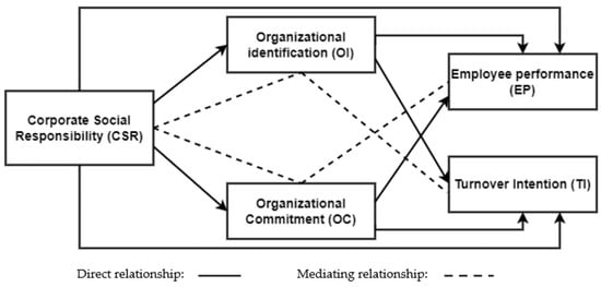 SIT is a theoretical framework that explains how individuals identify with groups and how this identification influences their attitudes and behaviors toward the group. In the context of corporate social responsibility (CSR), social identity theory proposes that employees identify with their organization and that this identification is influenced by the CSR initiatives that their organization engages in. In other words, employees see their jobs as contributing to the greater good. The relationship between CSR and employee outcomes (turnover intention, employee performance) is mediated by organizational identification and organizational commitment, which refers to the degree to which employees feel a sense of belonging and attachment to their organization. The relationship between CSR and employee outcomes (turnover intention, employee performance) is shown in Figure 1 [89,90,91]. One of the most important mediators between CSR and employee performance and intention to leave their current position is organizational identification and organizational commitment. Employees who perceive their company’s CSR efforts well are more likely to identify with their employer. This, in turn, leads to beneficial outcomes such as decreased desire to leave the company, increased performance, and increased willingness to assist others.