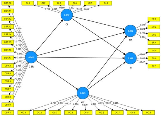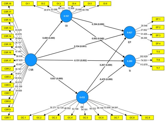 2.9. The Mediating Role of the OC and OI in the Relationship between CSR and EP, TI