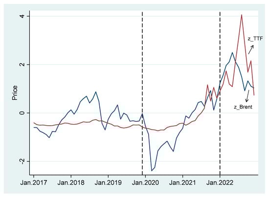 With respect to the dependent variables, due to the fact that the Brent and WTI oil prices have almost the same features which were mentioned before, for the sake of simplicity, we only use two types of the energy price indicators, namely the Brent and the TTF. To examine the impact of the COVID-19 pandemic on energy sector, the price data were analyzed using standard normalization processing, as shown in Figure 1 and Figure 2.