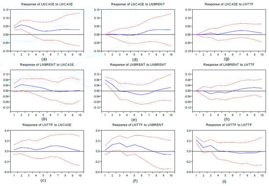 Based on the above Zivot–Andrews breakpoint unit root test results in Table 3, we can find that there are only the impulse asymptotic changes, i.e., no horizontal asymptotic changes and the unit root. In this case, it is necessary to conduct the impulse response analysis. Figure 3 plots the pairwise response relationships of the endogenous variables. As the aforementioned reason, we simply analyze the pairwise relations among the cases, the Brent and the TTF prices. When Cholesky is given one standard error innovation, the respective responses of lncase to lncase (a), lnBrent to lncase (b), and lnTTF to lncase (c) are displayed in Figure 3. Likewise, the rest of the impulse response graphs, namely, the responses of lncase to lnBrent (d), lnBrent to lnBrent (e), and lnTTF to lnBrent (f), and the responses of lncase to lnTTF (i), lnBrent to lnTTF (h), and lnTTF to lnTTF (g) are also presented in Figure 3. Essentially, these graphs can be classified into three groups: group 1 consists of (a–c), with lncase being the endogenous variable; group 2 consists of (d–f), with lnBrent being the endogenous variable; and group 3 consists of (g–i), with lnTTF being the endogenous variable. However, since we are more interested in group 1, which can be employed to capture the impact of the pandemic on the prices of oil and natural gas, the other two groups’ impulse response analyses are omitted.