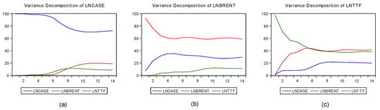 Figure 4 and Table 8 provide the results of the variance decomposition technique. In Figure 4a, when the shock is transmitted to the error term (innovation) of lncase, the variance percentage of lncase, lnBrent, and lnTTF is quite different. Specifically, in light of Table 8, regarding lncase itself, the impact dwindled from the initial 100 percent to less than 85 percent in period 7 and even below 71 percent in period 10. Meanwhile, the relative impact of lnBrent appears to be larger and larger: with its contribution level growing from zero in period 1 to around 6 percent in period 7 and over 18 percent in the final period. As to lnTTF, given the same shock, the contribution degree in periods 3–8 exceeds that of lnBrent, and in the rest of the periods, it is smaller when compared to that of lnBrent. In other words, the Brent and the TTF have opposite reactions, which is shown in Figure 4b,c. Technically speaking, the crude oil and the natural gas are substitutes, implying that when the price of the former goes up, the demand for the latter will increase and vice versa. Moreover, all the three endogenous variables become stable from period 10 onward, as indicated in Figure 4a–c.