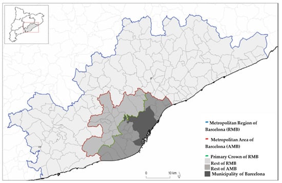 The Metropolitan Region of Barcelona (RMB), depicted in Figure 2, comprises about 200 municipalities. The 18 municipalities near Barcelona city define the EMT (Primary Crown) subarea (including Barcelona city divided into 10 districts). The Barcelona Metropolitan Area (AMB, Secondary Crown) subarea comprises 36 municipalities, including EMT, and 10 districts of Barcelona city, accounting for 3.2 million inhabitants. It has a well-scattered public transportation network with over 200 bus lines, 4000 stops, 10 metro lines, 15 railways, and 2 tramway lines. More than 9 million trips are made every day. The rest of the RMB consists of 164 municipalities and 1,848,514 inhabitants. More details can be found in [2].