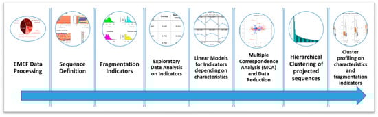 A statistical analysis of sequences and fragmentation indicators allows a greater depth of analysis, as indicated by the workflow shown in Figure 3 (the methodological workflow is inspired by [16]). Some potential lines of analysis rely on developing a general linear model using a fragmentation indicator as a target variable and quantitative and qualitative explanatory variables such as gender, education, day principal mode, etc. The marginal effects of explanatory variables help to clarify the multivariate association with the characteristics of individual units.