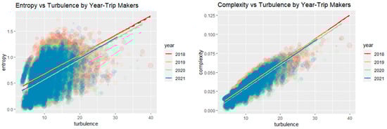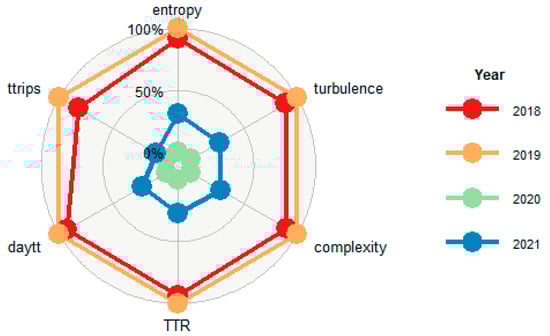 The sequences for all sampled units in the EMEF 2018 to 2021 travel surveys weighted by its expansion factor were produced by using the TraMineR package in RStudio [32,42]. Afterward, fragmentation indicators (entropy, turbulence, complexity, and TTR) were elaborated from daily travel sequences using functions in the TraMineR package of RStudio.