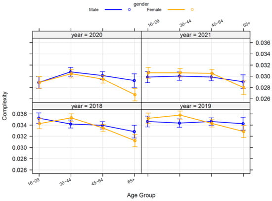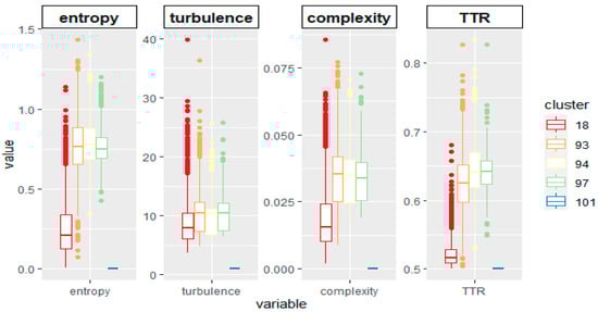 Fragmentation indicators are helpful to complement the previous interpretation (Figure 14). We can see the mean values of fragmentation indicators on radar plots for selected clusters with either male or female overrepresentation. Cluster 68, which is predominantly male, contains patterns involving considerable turbulence and complexity, without remarkable entropy or TTR, in contrast to the predominantly male clusters 83, 94, and 100. In the case of predominantly female clusters, cluster 34 shows shallow fragmentation indicators compared to clusters 48, 69, and 90.