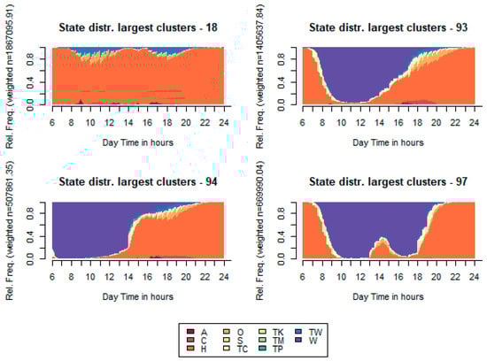 State distribution of the four largest clusters after activity sequence classification.