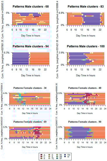 Some authors [48] found that the duration of free time and personal business activities were very similar between men and women. In contrast, women spent significantly more time shopping. If we extend this result, activity sequences in clusters overrepresented by women show remarkable differences from those dominated by men.