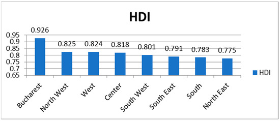 According to the data collected from the human development index in 2021, it is notable that the HDI is different in different regions, such as Bucharest, which has the highest value of HDI. Bucharest’s HDI is 0.926, North West’s HDI is 0.825, West’s HDI is 0.824, Centre’s HDI is 0.818, Southwest’s HDI is 0.801, South East’s HDI is 0.791, South’s HDI is 0.783, and North East’s HDI is 0.775 [41].
