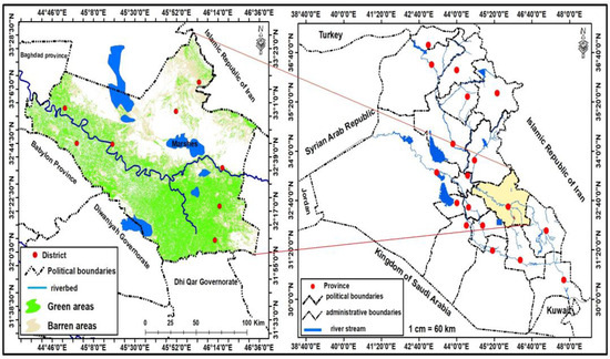 Iraq, located in the fastest-warming area of the world, faces temperatures up to 54 °C. It is experiencing significant effects of climate change, mainly drought, which results in decreased and altered precipitation patterns, as well as extreme heat waves [46]. The capital of Wasit Province, Al-Kut (Figure 1), which lies on the Tigris River in Southeastern Iraq [47], is approximately 40 square kilometres and is considered Iraq’s food basket [9]. The weather in Al-Kut City is considered normal but has short spring and fall seasons, approximately one month each, chilly in the winter and very dry and hot in the summer [48]. The Iraqi Meteorological Service states that the winter season officially starts in November and lasts until early March, the summer season lasting for most of the remaining months of the year, with June, July and August typically being the hottest months. Mean annual precipitation ranges between 150 and 300 mm [49].