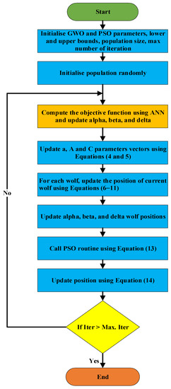 3.2. Hybrid Particle Swarm Optimisation–Grey Wolf Optimiser Algorithm (PSOGWO)