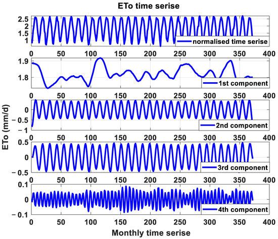 Step A from Figure 1 is represented here. The natural logarithm is used to normalise the data, the normalised time series is then analysed into 12 components using SSA to obtain noise-free, ETo, time series data. After denoising, the first component represents the time series with the highest value. The normalised time series and the first four components of the ETo parameters are shown in Figure 4. Pre-processing of data improves the correlation coefficients (CCs) between the ETo (target) and model inputs (lags). For example, the CC of Lag 1’s raw data is increased from 0.83 to 0.99. The CCs for the first four lags in the denoised data were 0.99, 0.96, 0.91 and 0.85, respectively.