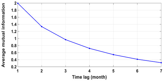 The MI method (shown in Figure 5) was used to determine the best possible input scenario for the model (univariate technique). According to Stergiou [88], the time lag is selected as the first minimum of average mutual information (AMI). Based on the AMI figure, four lags (Lag 1–Lag 4) of the monthly ETo values are used to simulate future monthly ETos.