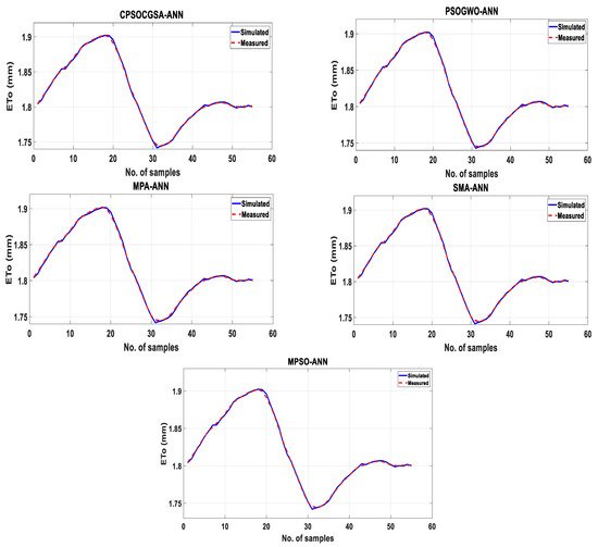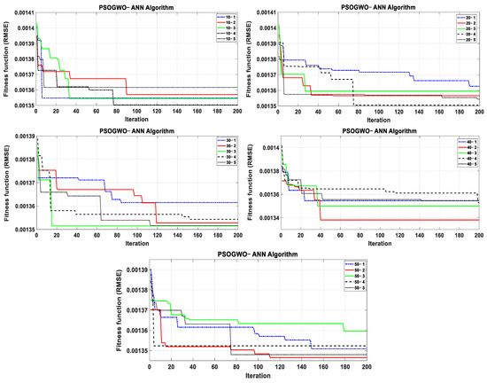 Training, testing and validation datasets are created after data pre-processing techniques are applied. To construct a reliable ETo prediction model, a systematic configuration of the ANN model, rather than trial and error, is required. Therefore, the optimal values for the ANN model’s hyperparameters, Lr, N1 and N2, are determined using a combination of four hybrid methods: PSOGGWO-ANN, CPSOCGSA-ANN, MPA-ANN and SMA-ANN based on the MATLAB toolbox. These hybrid techniques were tested with five different popsizes, 10, 20, 30, 40 and 50. The maximum number of iterations is set to 100 for all algorithms. In order to find the best possible solution, it can run each algorithm’s popsize five times, i.e., for the PSOGWO-ANN algorithm shown in Figure 6, the best popsizes are 10-4, 20-4, 30-3, 40-2 and 50-2.