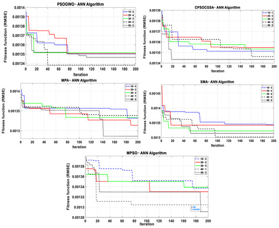 The best popsize is then chosen for each algorithm so that it can be compared to other popsizes for the same algorithm (Figure 7). The best popsizes are shown in the figure to be 50-2 for MPA-ANN (RMSE = 0.00128 after 141 iterations), 40-2 for SMA-ANN (RMSE = 0.0013, after 96 iterations), 40-2 for PSOGWO-ANN (RMSE = 0.001338, after 40 iterations), 50-5 for CPSOCGSA-ANN (RMSE = 0.001343, after 18 iterations) and 50-3 for MPSO-ANN (RMSE = 0.001291, after 188 iterations).