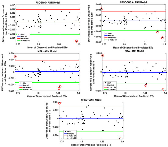 where is the monthly ETo determined by the standard FAO-56 PM formula, the predicted monthly ETo as determined by the prediction models used, the mean of the calculated monthly ETo, the mean of the predicted monthly ETo and N the data length. In addition, graphical plots, i.e., Bland–Altman, have been applied to examine the predictive performance of the suggested method.