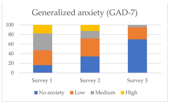 Percentage of respondents with no anxiety and low, medium and high intensity of anxiety symptoms measured via the Generalized Anxiety Disorder Questionnaire (GAD-7) at three time points.