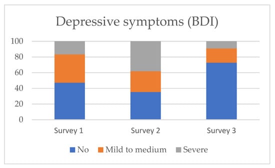 Percentage of respondents with no depression, mild to medium and severe intensity of depressive symptoms measured via the Beck Depression Inventory at three time points.