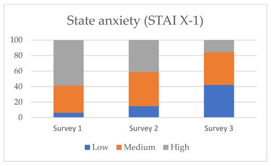 Percentage of respondents with low, medium and high intensity of anxiety symptoms measured via the State Anxiety Inventory (STAI X-1) at three time points.
