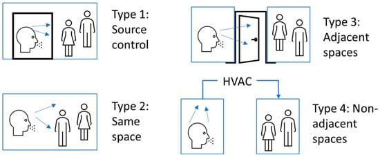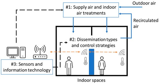 The first topic is “Supply Air and Indoor Air Treatments”, whose duty is to provide clean air to indoor spaces by supplying outdoor air via ventilation or removing air contaminants using air-cleaning technologies. The second topic is “Dissemination Types and Control Strategies”. Even if the indoor spaces receive clean air, air contaminants generated within them can still disseminate and affect IAQ at various scales. In this topic, we will classify four dissemination situations and discuss their engineering controls. The third topic is “Sensors and Information Technology”, where the dashed lines in Figure 1 represent the information flow with two possible functions. The first function is monitoring, where sensors can collect the IAQ data from the indoor spaces. The second function is to utilize the IAQ data to facilitate air treatments and limit the dissemination of indoor air contaminants.