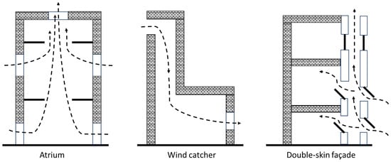 Reviews by [25,131] have discussed different architectural elements (e.g., window-to-wall ratios and building orientation) and specialized designs (e.g., atrium/shaft, wind tower/catcher, and double-skin façade) for natural ventilation. Figure 2 shows simplified schematics of an atrium, wind tower, and double-skin façade to illustrate the airflow with these architectural elements. Subsequent reviews have focused on evaluation tools for natural ventilation, such as mapping evaluation tools to design stages [132], the use of tracer gas [133], and computational techniques (e.g., CFD, parameterization, and optimization) [26]. Other reviews have concentrated on specialized building features and natural ventilation, including balcony design, occupants’ perception [134], and underground buildings [135]. Recent review papers extend the scope of natural ventilation to address issues related to thermal comfort (and heatwave resilience) [136], the integration of natural ventilation technologies [27], and classrooms in response to COVID-19 concerns [137]. In this section, we intend to review key engineering ideas for natural ventilation, incorporating recent work that may not be covered by these review papers.