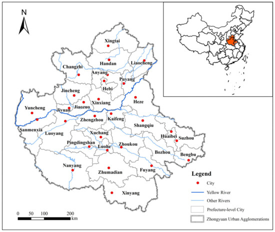 The Zhongyuan urban agglomeration is the fifth national urban agglomeration after the middle reaches of the Yangtze River, Harbin-Changchun, Chengdu-Chongqing, and the Yangtze River Delta urban agglomeration. It includes 30 cities in five provinces (Henan, Shanxi, Hebei, Shandong and Anhui), 287,000 square kilometers of land and more than 16 million people; the location map is shown in Figure 1. As a new engine and growth pole for the central area of the region, the Zhongyuan urban agglomeration is not only rich in natural resources and raw materials but is also a transportation hub extending in all directions. At same time, it is also an essential part of the Yellow River Basin that needs an accelerating process of high-quality development [4].