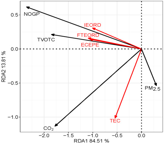 In our research, the ecological innovation input indices were set as the interpretation variables and the ecological innovation output indices were set as the response variables; the RDA was applied to test the correlation relationship between ecological innovation inputs and outputs, and the canocoso5.0 software is applied to obtain the result. Firstly, as shown in Figure 3, the total cumulative interpretation rate of the interpretation variable (the ecological innovation input variables) to the response variable (the ecological innovation output variables) was 98.32%. Moreover, red arrows represent all ecological innovation input variables, and black arrows represent all ecological innovation output variables. The correlation between the variables that the vectors represent can be obtained by analyzing the angle cosine between vectors. The detailed analysis results include: (1) The main economic outputs (the transaction value of technology contracts and the number of green patents) are strongly related to the other three indicators of the ecological innovation inputs, which include the full-time equivalent of R&D personnel, the internal expenditure on the R&D fund and the resource conservation and environmental protection expenditure. This indicates that the desirable output of ecological innovation cannot be separated from the human and financial input of innovation. The energy conservation and environmental protection expenditure of local government departments has promoted the number of green patents authorized. (2) The growth of energy conservation and environmental protection expenditure can reduce the PM2.5 density as some more environmentally friendly production processes are adopted and air pollution gas emissions are controlled. (3) The analysis results show that the undesirable outputs including PM2.5 density and CO2 emissions are highly correlated with the total energy consumption. Energy consumption is an important driver of economic development, but it inevitably brings some undesirable outputs that are harmful to the environment. In order to achieve green, energy-saving and innovative development, we should continue to reduce the consumption of all kinds of energy.