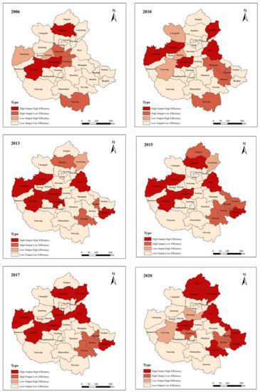 After measuring the output benefit and transformation efficiency of ecological innovation, 30 cities in the Zhongyuan urban agglomeration in 2006, 2010, 2013, 2015, 2017 and 2020 were classified according to the level of ecological innovation performance, taking the average value of the urban agglomeration in each year as the benchmark, respectively, and defining those above the average value as “high level” and those below the average value as “low level”. Finally, the ArcGIS 10.8 software was adapted to draw the spatial distribution evolution of ecological efficiency performance of 30 cities in the Zhongyuan urban agglomeration from 2006 to 2020, and the results are shown in Figure 4.