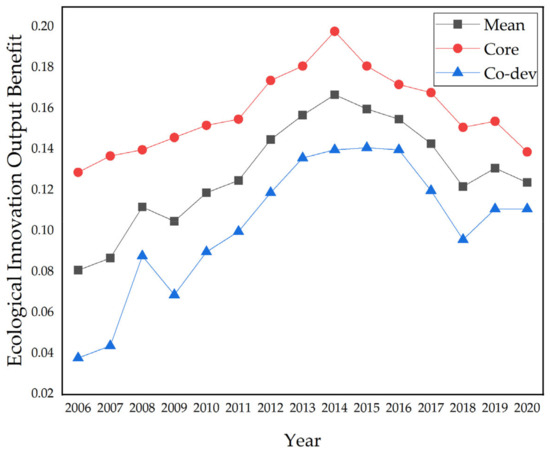 Moreover, the measurement of the ecological innovation transformation efficiency showed more interesting results (shown in Figure 6). In the years 2006, 2010 and 2014, the measurement results indicated that the innovation transformation efficiency of the core development region was significantly higher than that of the co-development region. However, since 2015, the transformation efficiency of the co-development region has been much higher than that of the core development region. The reason may be that most of the cities in the core development region had a lack of innovation and transformation, especially since there was a big gap between them and the cities in the co-development region in terms of crucial output indicators such as the turnover of technology market contracts. First, by analyzing the data of the starting year 2006, it can be seen that the average change range of the transformation efficiency of the core development region compared with the co-development region was 34%, and the average change range of the output benefit was 70%. In December 2016, the National Development and Reform Commission of China issued the Zhongyuan Urban Agglomeration Development Plan, so 2017 was selected as the representative year for analysis. The calculation results showed that the average change in innovation transformation efficiency was −7%, and the average change in output benefit was 48%. Finally, the calculation results of 2020, the year at the end of the evaluation cycle, indicated that the average change in innovation transformation efficiency was −30%, and the average change in output benefit was 29%.