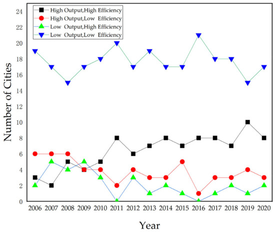 To analyze the performance level of ecological innovation from the temporal dimension, Figure 7 reveals that the number of cities with different ecological innovation performance levels showed a slight fluctuation trend. It should be noted that the number of cities with a “low output and high efficiency” level fluctuated the most, basically showing an inverted U-shaped trend. In addition, it is noteworthy that the number of cities with a “low output and low efficiency” level fluctuated between 15 and 21, accounting for more than half of all the cities in the urban agglomeration, which indicates that the Zhongyuan urban agglomeration is still in the development stage of high input and low efficiency; environmental pollution and energy consumption are still being maintained at a relatively high level; the transformation efficiency of ecological innovation in particular is far from meeting expectations, and the evolution of the urban agglomeration is still facing the dilemma of high energy consumption and low output benefits. Therefore, the relationship between the ecological environment, energy consumption and innovation-driven development has yet to be effectively improved. At the same time, we can recognize that the number of cities with “high output and high efficiency” fluctuates between 2 and 10, accounting for about one third of all cities in urban agglomerations. This illustrates that apart from Zhengzhou, which is positioned as a national central city, Luoyang, Bengbu, Handan, Heze and other cities have made significant progress in energy conservation and environmental protection, efficient utilization of resources, ecological innovation transformation, and have created a development model that coordinates resources, environment and innovation-driven development. The ecological innovation performance of the Zhongyuan urban agglomeration, driven by such major strategies, including “ecological protection and high-quality development in the Yellow River basin”, “high-quality development in the central region”, and “self-reliance and self-reliance in a high-level of science and technology”, continues to promote industrial transformation and upgrading, energy conservation and emission reduction, and always adheres to ecological innovation-driven development.
