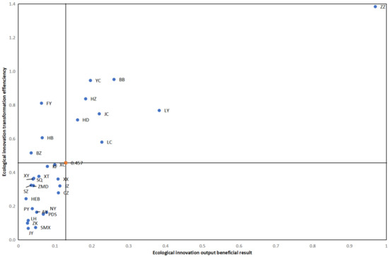 Oduro et al., conducted a detailed review of green innovation, which reveals that green innovation has aroused the enthusiasm of researchers in the last decade, and scholars generally use empirical research to conduct research [14]. To measure the balance of economic development, resource utilization and the natural environment, scholars have an interest in ecological innovation efficiency or green innovation efficiency. Ecological innovation was thought to be a dynamic and complex process and reduced environmental pressure to a certain extent [15]. Using the research of Alegre and Wang for reference [16,17], this study comprehensively considered the process and results of ecological innovation and concluded that the ecological innovation performance is a collection of the output benefit of the ecological innovation input and the transformation efficiency between input and output under the impact of the innovation milieu and the constraints of innovation resources within a specific period. Based on this, the ecological innovation performance was divided into four levels, including high output and high efficiency, low output and high efficiency, low output and low efficiency, high output and low efficiency. Using the mean value of ecological innovation output benefits and transformation efficiency of all 30 cities in the sample data as the benchmark, values above the benchmark are defined as high levels, and values below the benchmark are defined as low levels, thereby achieving the classification of urban ecological innovation performance levels in urban agglomerations.