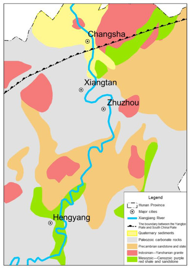 The Xiang River is one of the most important tributaries of the middle reaches of the Yangtze River, with a basin area of 85,383 km2. The basin is dominated by mountains and hills, and the landforms are complex and diverse. Nonferrous metal deposits such as Precambrian metamorphic sand slate, Indosinian Yanshanian granite, Paleozoic carbonate rock, Mesozoic Cenozoic red clastic rock, Quaternary sediments, and Pb-Zn are widely distributed [21,22,23]. In the middle and lower reaches of the Xiangjiang River, the red rock system of the Tertiary period is mainly distributed, which belongs to continental sedimentation. There are more than ten kinds of proven minerals in the basin, such as lead, zinc, sulfur, gold, and silver. Figure 1 shows the simplified geological and geomorphological map of the middle and lower reaches of the Xiangjiang River.