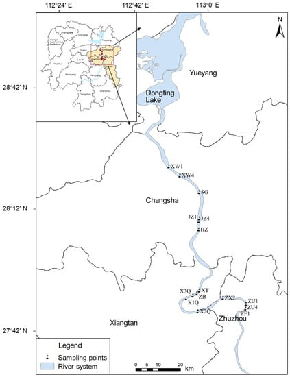 - XT River section: including five sampling points, namely Xiangtan Second Bridge (X2Q), Xiangtan First Bridge (X1Q), Xiangtan Three Bridges (X3Q), Zhubu Port (ZB), and Fengtan Bridge (XT).