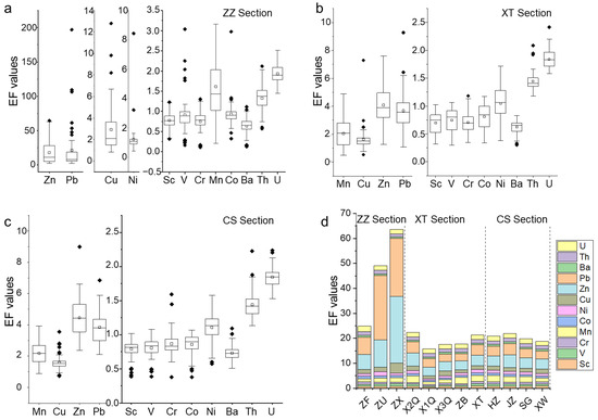 The EF value of the XT section is shown in Figure 4b and Figure S3. For the XT column, Mn (EF = 2.49), Zn (EF = 4.20), and Pb (EF = 4.11) reached moderate pollution, and Co (EF = 1.00), Ni (EF = 1.31), Cu (EF = 1.62), Th (EF = 1.41), and U (EF = 1.91) reached mild pollution. For the ZB column, Mn (EF = 2.58), Zn (EF = 3.53), and Pb (EF = 2.86) reached moderate pollution, and Ni (EF = 1.07), Cu (EF = 1.19), Th (EF = 1.49), and U (EF = 1.83) reached mild pollution. For the X3Q column, the Zn (EF = 3.66) and Pb (EF = 3.08) reached moderate pollution, while the Mn (EF = 1.27), Cu (EF = 1.97), Th (EF = 1.41), and U (EF = 1.82) reached mild pollution. For the X1Q column, the Zn (EF = 3.40) and Pb (EF = 3.57) reached moderate pollution, and the Mn (EF = 1.06), Cu (EF = 1.24), Th (EF = 1.60), and U (EF = 1.83) reached mild pollution. For the X2Q column, only Zn (EF = 5.19) reached significant pollution, followed by the moderate pollution of Mn (EF = 2.68) and Pb (EF = 4.48), and the mild pollution of Ni (EF = 1.18), Cu (EF = 1.80), Th (EF = 1.40), and U (EF = 1.80).